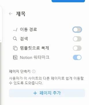게시탭 > [사이트 사용자 지정] 탭을 선택해 이동경로/검색/ 템플릿으로 복제 부분의 모두 비활성화 해주세요