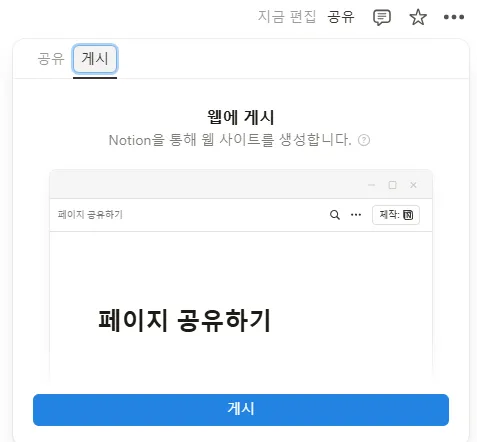 - 오른쪽 상단에 [공유] 탭을 선택하고 페이지 게시해주세요